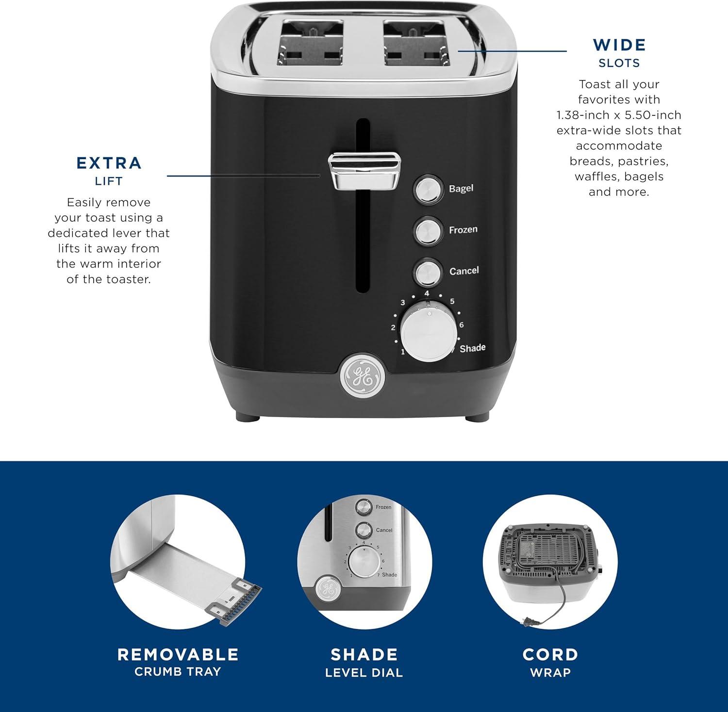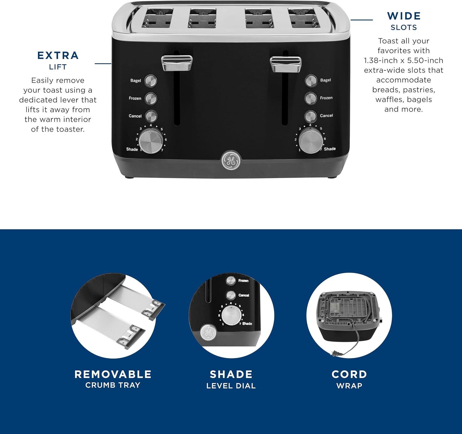GE 4 Slice Toaster | Extra Wide Slots for Bagels, Breads, Waffles & More | 7 Shade Options | Countertop Kitchen Essentials | 1500 watt, White(Black)